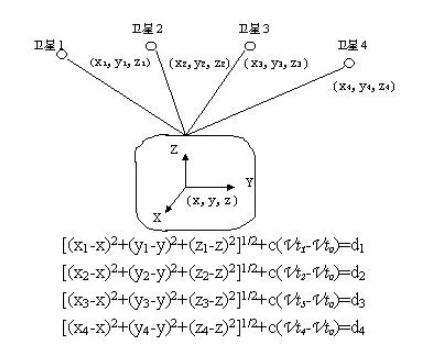 GPS的定位原理說白了就是通過四顆已知位置的衛(wèi)星來確定GPS接收器的位置。要達到這一目的,衛(wèi)星的位置可以根據(jù)星載時鐘所記錄的時間在衛(wèi)星星歷中查出。而用戶到衛(wèi)星的距離則通過紀錄衛(wèi)星信號傳播到用戶所經歷的時間,再將其乘以光速得到(由于大氣層電離層的干擾,這一距離并不是用戶與衛(wèi)星之間的真實距離,而是偽距)。當GPS衛(wèi)星正常工作時,會不斷地用1和0二進制碼元組成的偽隨機碼(簡稱偽碼)發(fā)射導航電文。導航電文包括衛(wèi)星星歷、工作狀況、時鐘改正、電離層時延修正、大氣折射修正等信息。然而,由于用戶接受機使用的時鐘與衛(wèi)星星載時鐘不可能總是同步,所以除了用戶的三維坐標x、y、z外,還要引進一個變量 t 即衛(wèi)星與接收機之間的時間差作為未知數(shù),然后用4個方程將這4個未知數(shù)解出來。所以如果想知道接收機所處的位置,*少要能接收到4個衛(wèi)星的信號。如下圖所示: