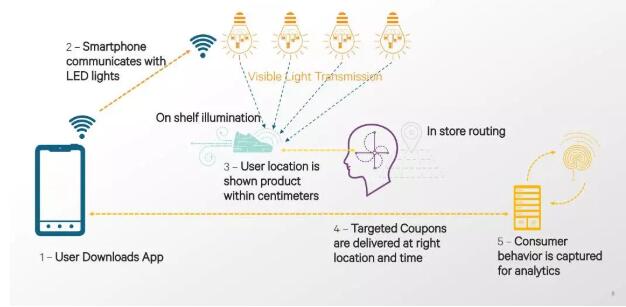 目前,可見光技術在北美有很多商場已經在部署。用戶下載應用后,到達商場里的某一個貨架,通過**貨架周圍的燈光即可知曉具體位置,商家在通過這樣的方法向消費者推動商品的折扣等信息。